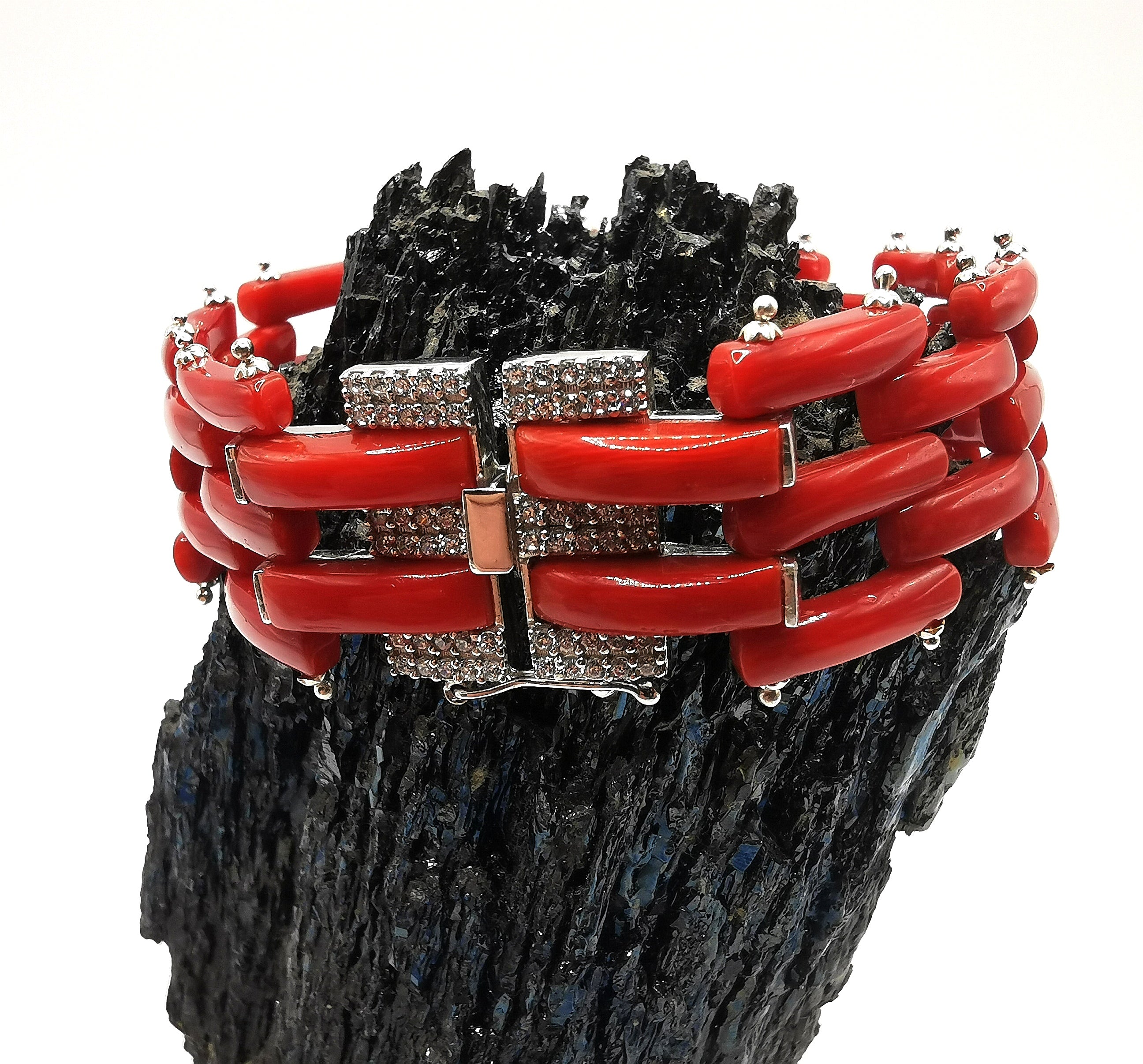 anello con fascetta di corallo e zirconi in argento 925 rodiato